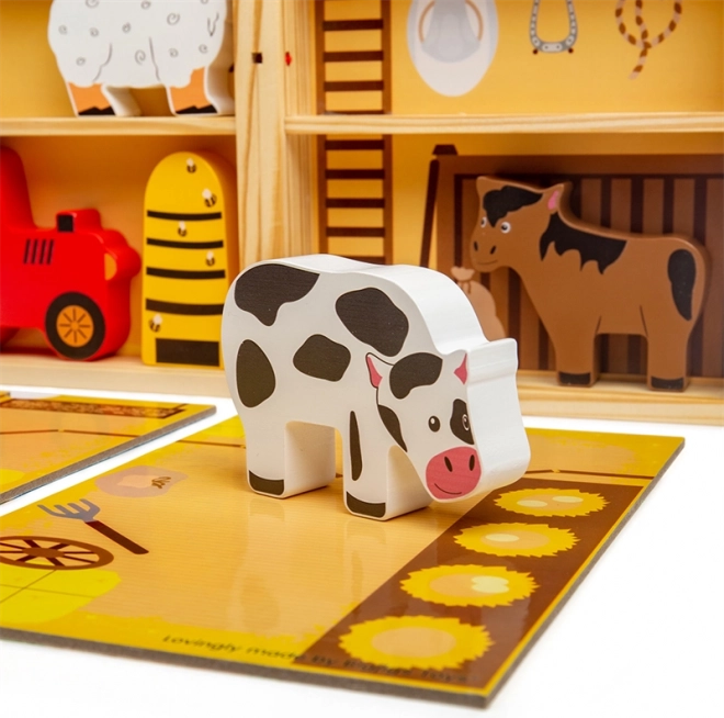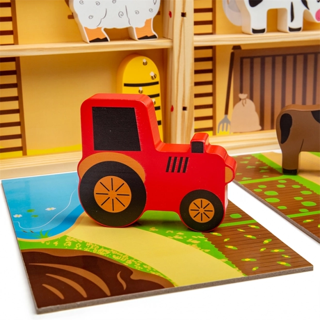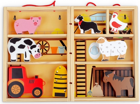 W zestawie znajdują się zwierzątka (koń, krowa, pies, świnia, owca), ul oraz traktor. Wyraziste kolory i bezpieczne wykonanie z litego drewna.