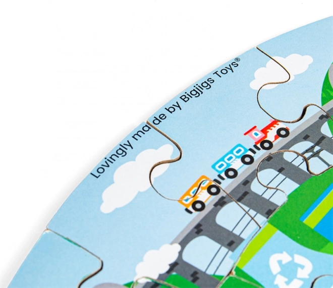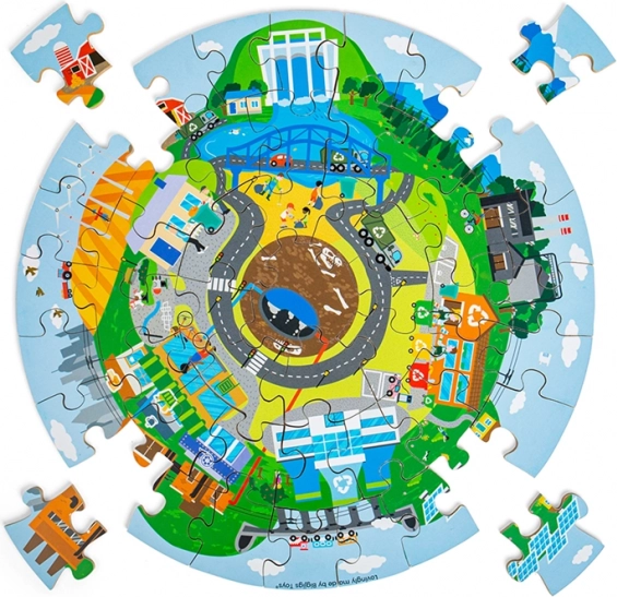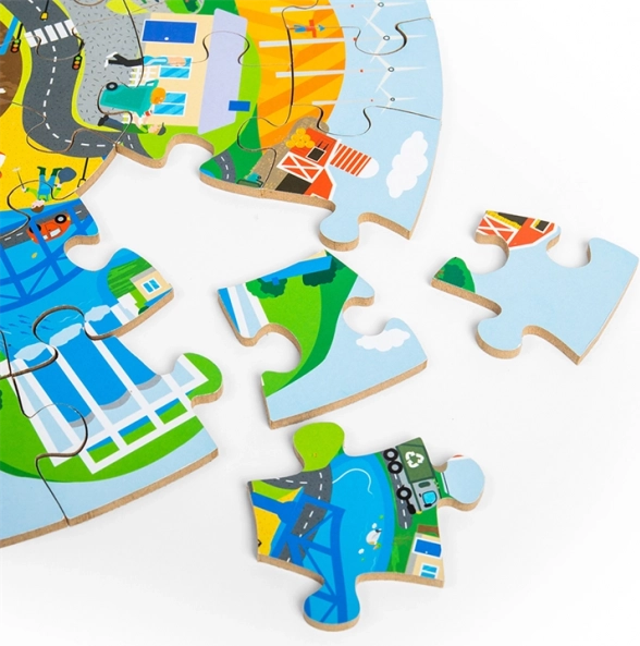 Wysokiej jakości drewniane puzzle w kształcie koła to świetny wybór na pierwsze edukacyjne układanki. Dzięki wyrazistym barwom i wciągającym scenom z miasta i natury dzieci łatwo odnajdują się w temacie segregacji odpadów i ochrony środowiska.