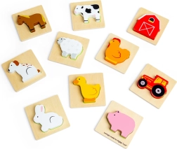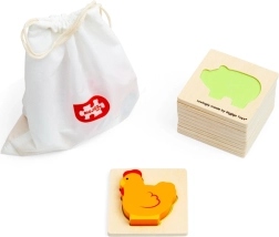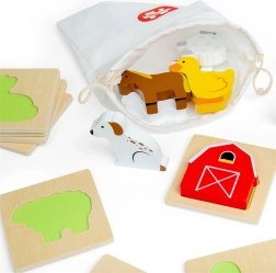 Ta podróżna gra o tematyce farmy daje dzieciom radość odkrywania. Wkładają rękę do materiałowego woreczka i dotykiem szukają elementu, który pasuje do odpowiedniej drewnianej podstawki. Zabawa, która dyskretnie wspiera koncentrację, koordynację oko–ręka oraz słownictwo podczas nazywania zwierząt i przedmiotów z farmy.