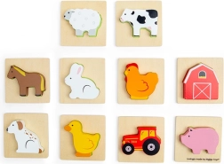 Zestaw zawiera 8 ulubionych zwierząt gospodarskich i 2 motywy farmerskie (traktor i stodoła). Elementy są solidne, kolorowe i przyjemne w dłoni. Dzięki kompaktowemu materiałowemu woreczkowi gra świetnie sprawdzi się w podróży, w restauracji i u dziadków.