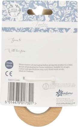 Gładki drewniany pierścień o naturalnie antybakteryjnych właściwościach przynosi ulgę podczas ząbkowania i jest delikatny dla dziecięcych dziąseł.