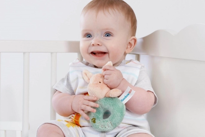 Ta zabawka wyposażona jest w delikatną grzechotkę, która wspiera rozwój zmysłów i stymulację dziecka poprzez dźwięk i dotyk.