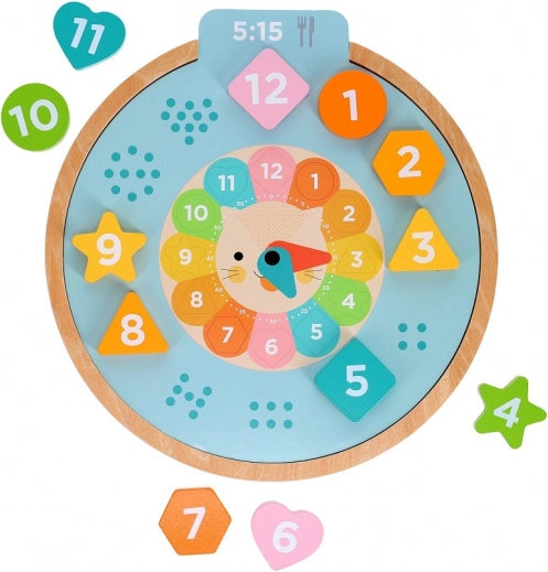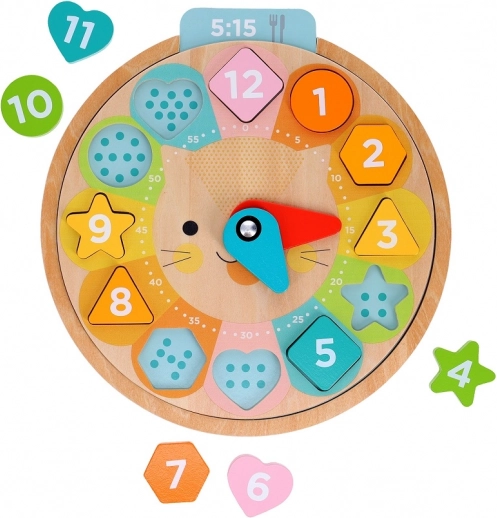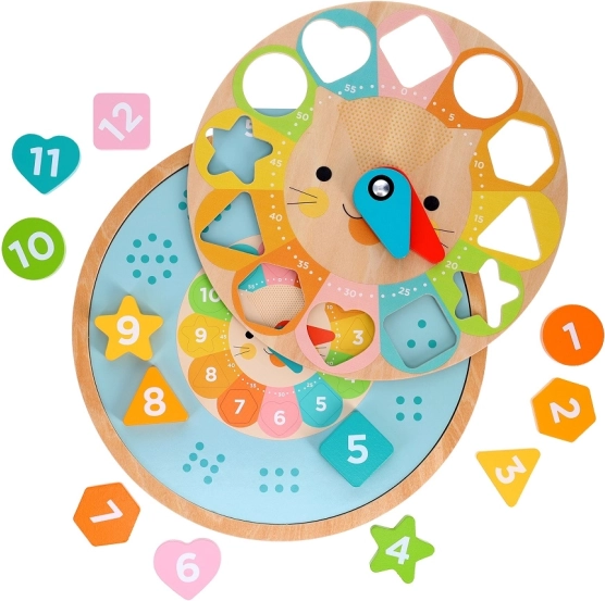 Zawiera ruchome wskazówki i kształty, które dzieci mogą umieszczać na odpowiednich miejscach, co stymuluje koordynację i zdolności motoryczne.
