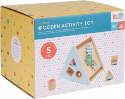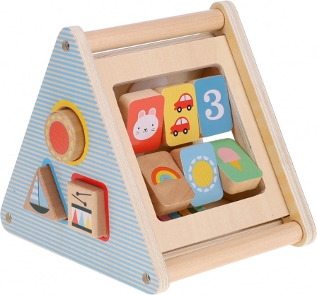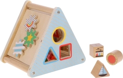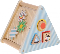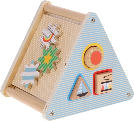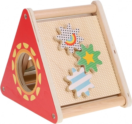 Zabawka zawiera różne wycięcia do wkładania kształtów i koła zębate do rozwijania drobnej motoryki.