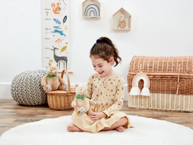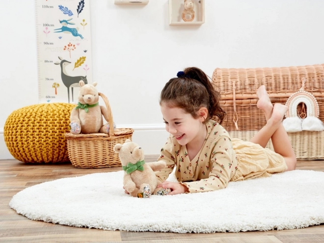 Miś został zaprojektowany z myślą o planecie – użyte materiały są zrównoważone, a wypełnienie stanowią włókna z recyklingowanych plastikowych butelek. Stylowa zielona chusta z kokardką oraz subtelny leśny wzór na łapkach nadają mu ponadczasowy wygląd, który ucieszy dzieci i rodziców. Odpowiedni od urodzenia, świetny jako prezent dla noworodka.