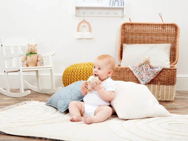 Urocza grzechotka łączy miękki plusz z naturalnym drewnianym kółkiem dla łatwego chwytu i delikatnej stymulacji sensorycznej. Wykonana z materiałów zrównoważonych z wypełnieniem z plastiku z recyklingu, odpowiednia od urodzenia i idealna jako prezent dla noworodka.