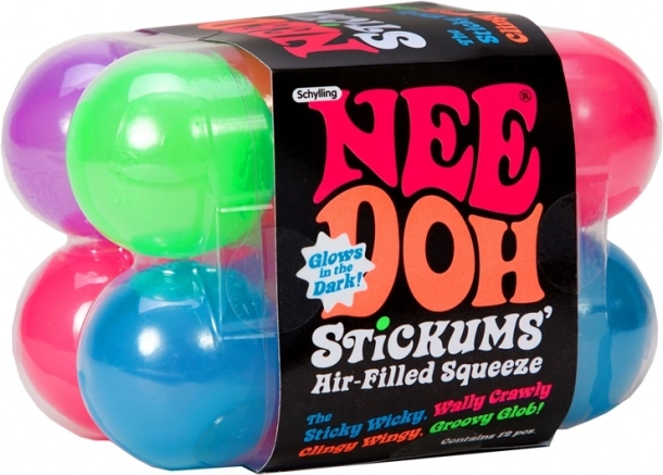 NeeDoh Stickums łączy relaks i zabawę w praktycznym wydaniu. Piłeczki mają przyjemnie miękką, lepką powierzchnię, dzięki czemu można je nie tylko ugniatać, ale też przyklejać i rzucać na gładkie powierzchnie – ściany, okna czy sufity – i obserwować, jak powoli odklejają się i spadają.