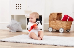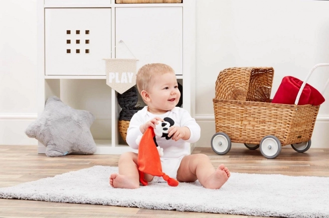 Węzełki do chwytania w rogach i charakterystyczne uszka wspierają rozwój małej motoryki oraz ciekawość najmłodszych.