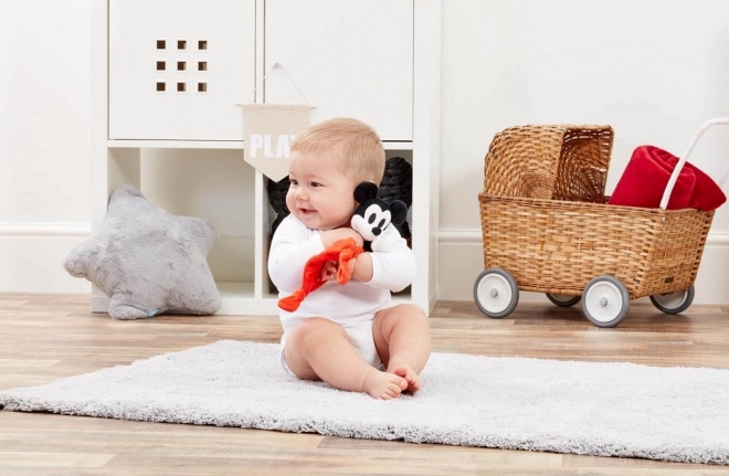 Ten mięciutki pluszowy przytulaczek z postacią MICKEY MOUSE daje dzieciom poczucie bezpieczeństwa i komfortu w ciągu dnia i podczas zasypiania. Miękki kocyk zachęca do tulenia, a węzełki w rogach i wypukłe detale wspierają naturalną stymulację sensoryczną.