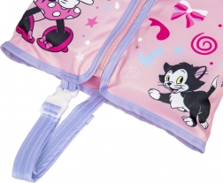Dla maksymalnego komfortu i bezpieczeństwa wyposażono ją w przedni zamek błyskawiczny z listwą osłaniającą oraz regulowany pasek kroczny, który zapobiega podwijaniu kamizelki. Tekstylna powierzchnia z UPF 50+ jest przyjemna w dotyku i odporna na blaknięcie. Kamizelka jest przeznaczona jako pomoc do nauki pływania i zawsze musi być używana pod nadzorem dorosłych.