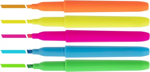 W zestawie znajduje się pięć wyrazistych kolorów (pomarańczowy, żółty, różowy, niebieski, zielony) z szeroką, ściętą końcówką dla płynnego i intensywnego kolorowania.