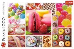 Puzzle z 1000 elementów przedstawiające kolaż obrazków ze słodkimi, kolorowymi cukierkami. Puzzle mogą stanowić dekorację ścienną w kuchni i jadalni, a także w pokoju dziecięcym. Po ułożeniu powstanie obraz o wymiarach 68x48 cm. Wysoką jakość, intensywność kolorów i bezpieczeństwo puzzli zapewnia kalandrowany papier refleksyjny, pokryty ekologicznymi farbami spożywczymi.