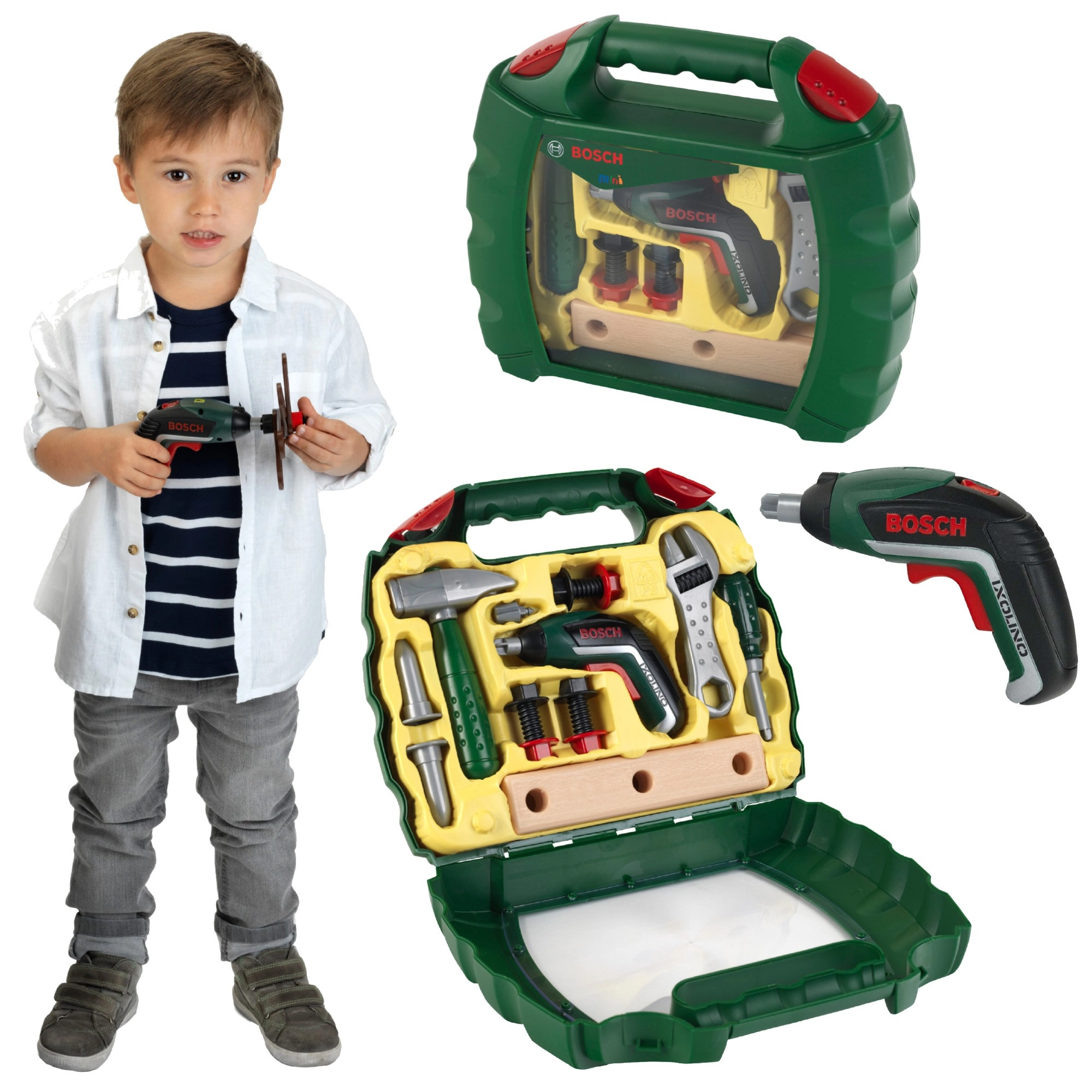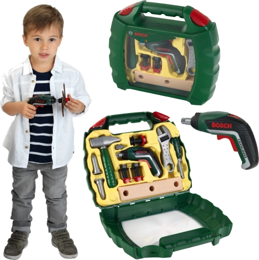 Praktyczna dziecięca walizka z narzędziami z licencjonowanej serii BOSCH Mini marki Klein ucieszy każdego małego majsterkowicza. Zawiera funkcyjną zabawkową wkrętarkę akumulatorową Ixolino II z wymiennymi bitami, trybem prawo/lewo oraz dźwiękiem silnika, uzupełnioną o młotek, śrubokręt, klucz francuski, śruby, nakrętki i „drewniane” elementy. Solidna ciemnozielona walizka z przezroczystym frontem i podwójną czerwoną klamrą bezpiecznie utrzymuje wszystko na miejscu.
