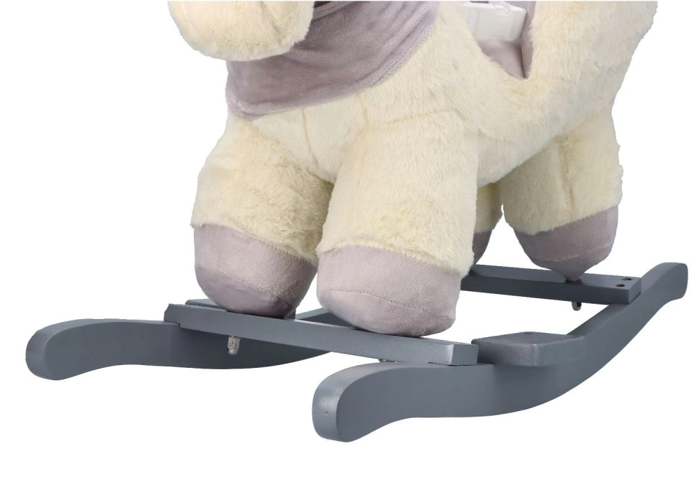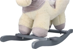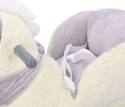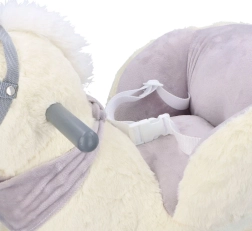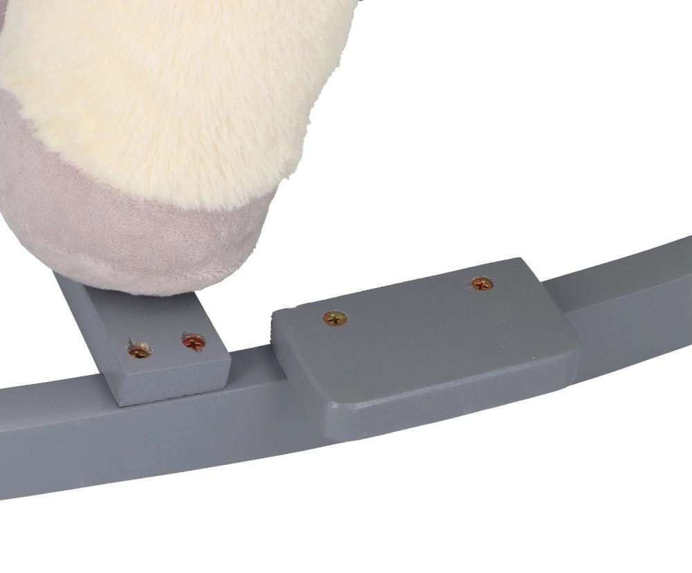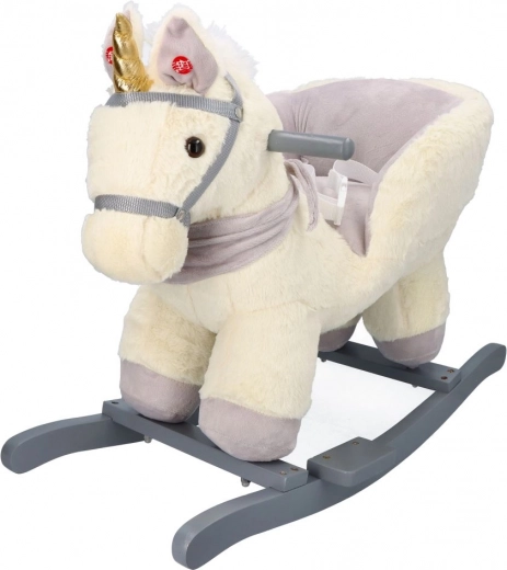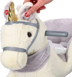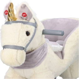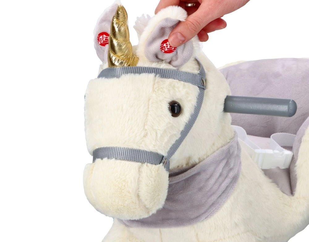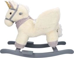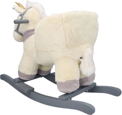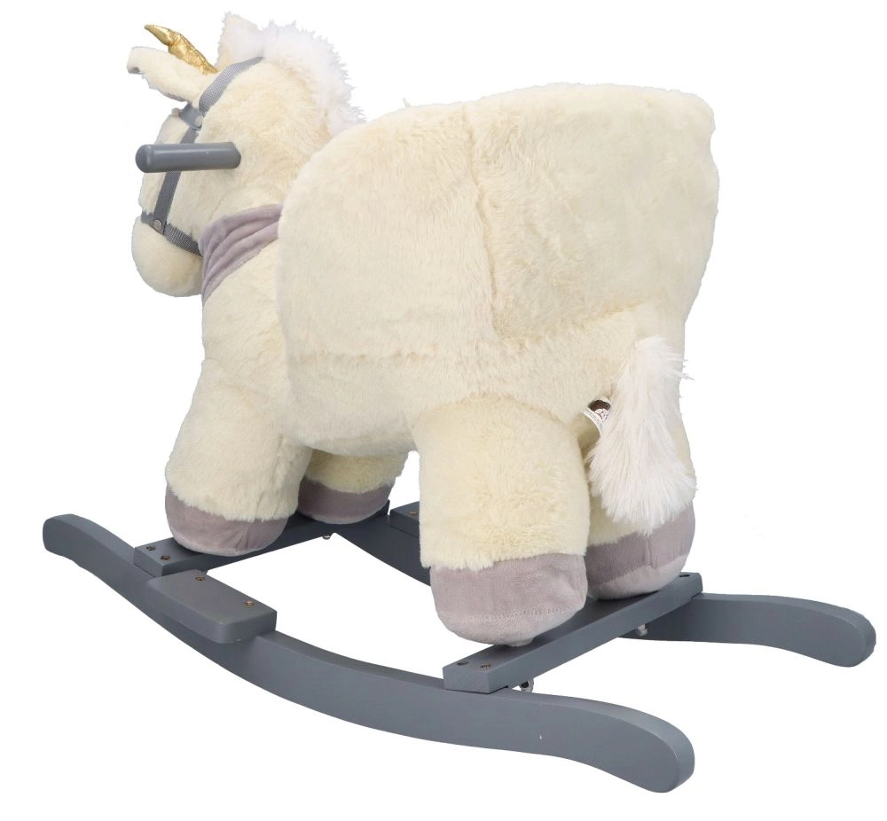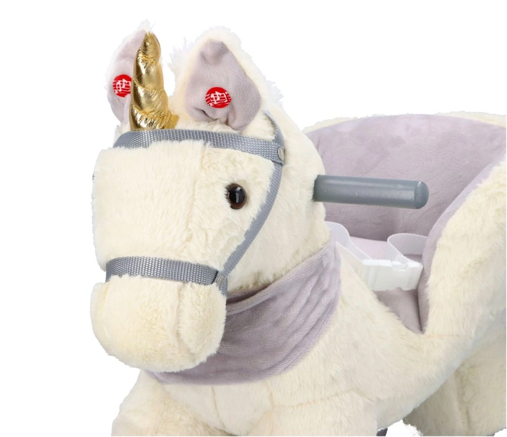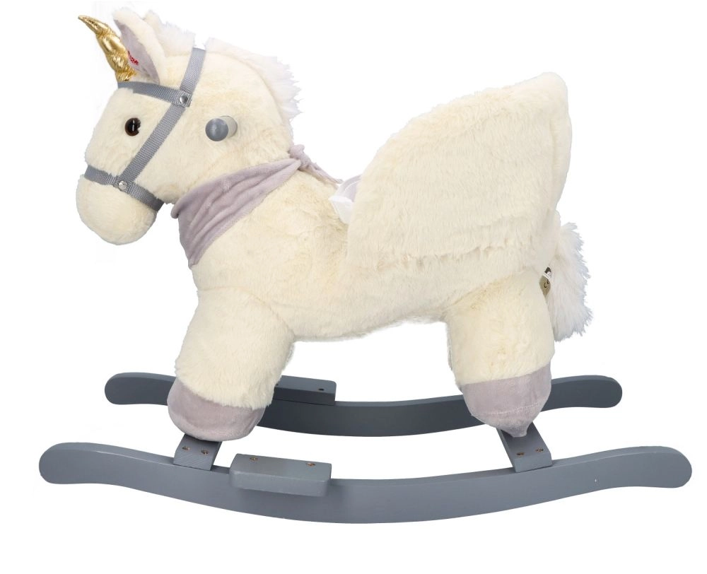 Ten pluszowy bujany jednorożec ze złotym rogiem i subtelnymi szarymi detalami to idealny wybór do domowej zabawy. Miękkie siedzisko z podłokietnikami i pasem bezpieczeństwa zapewnia wygodę i stabilność, a drewniane płozy i uchwyty gwarantują pewny i płynny ruch.