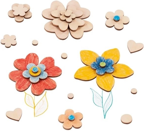 Dzięki temu kolorowemu zestawowi drewnianych płatków w kształcie kwiatuszków stworzysz oryginalne dekoracje, kartki okolicznościowe, obrazki oraz sezonowe ozdoby. Elementy o wymiarach od 7 do 32 mm łatwo się przykleja, łączy i maluje, dzięki czemu dzieci mogą rozwijać swoją wyobraźnię i zręczność.
