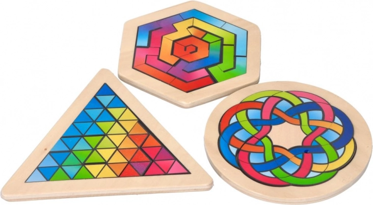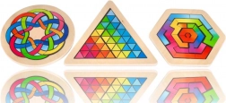 Kolorowe elementy tworzą proste wzory i bardziej złożone ornamenty. Dzieci ćwiczą wyobraźnię oraz postrzeganie kolorów i kształtów.