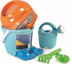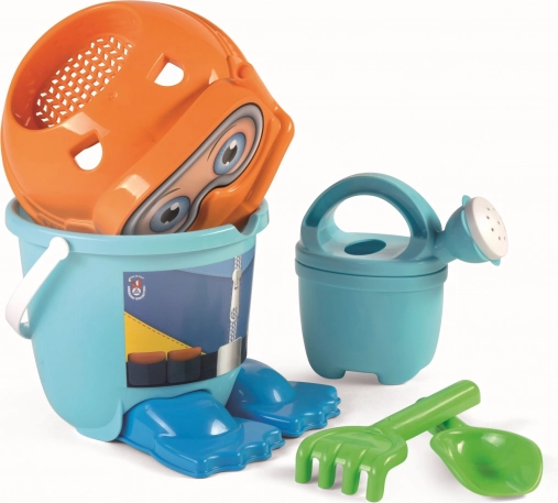 - Wiaderko, sitko w kształcie głowy nurka, 2 foremki w kształcie płetw nurkowych, konewka, łopatka, grabki