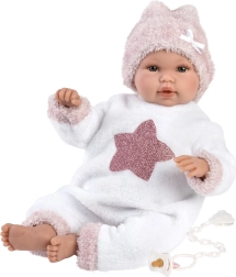 Urocza lalka LLORENS New Born 36 cm zachwyca realistycznym wykonaniem, miękkim materiałowym ciałkiem i dźwiękami niemowlęcia. Po naciśnięciu klatki piersiowej mówi „mama”, „papa” i wydaje autentyczny płacz. Ma ruchome kończyny na przegubach, może także siedzieć i jest idealna do opiekuńczej zabawy. Ręcznie wykonana w Hiszpanii, dostarczana w pudełku prezentowym.