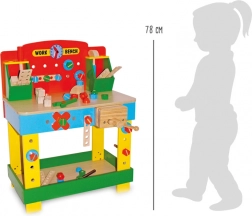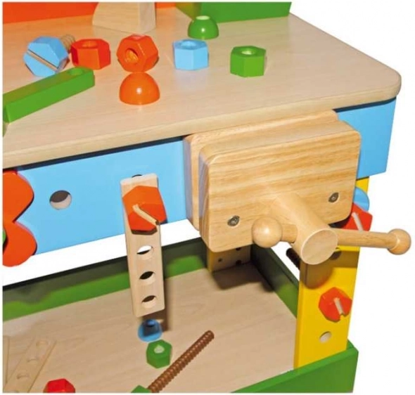 Odkryj wysokiej jakości dziecięcy warsztat z litego drewna bukowego i kolorowej sklejki, który wspiera kreatywną zabawę, motorykę małą i zręczność manualną. Solidny stół roboczy z funkcjonalnymi elementami i akcesoriami jest idealny dla małych majsterkowiczów od 3 lat.