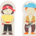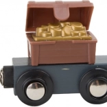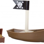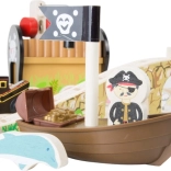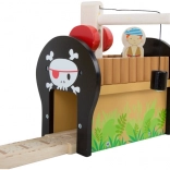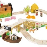 Wejdź do świata piratów i fantazji. Sześciu piratów włada własną kolejką na wyspie, gdzie drewniane tory prowadzą przez most z dzwonkiem, a pociąg przewozi armatę i skrzynię pełną złota. Stacja dźwigowa z magnetycznym hakiem umożliwia łatwy załadunek – wystarczy obrócić mechanizm i opuścić magnes w dół.