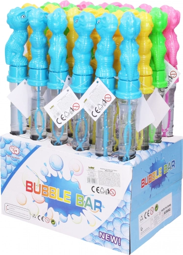 Zabawny bąbelkowy płyn w kształcie dinozaura ucieszy małych i dużych. Dzięki pojemności 100 ml i długości 35 cm stworzysz mnóstwo pięknych baniek. Dostępne są 4 warianty kolorystyczne – niebieski, żółty, zielony i różowy.