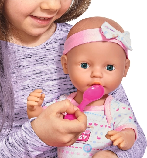 Ta funkcjonalna lalka w uroczym różowo‑białym ubranku to idealna towarzyszka codziennej zabawy w opiekę nad niemowlęciem. Dzieci mogą lalkę karmić, poić, podać jej smoczek, zmienić pieluszkę i posadzić na nocnik. Realistyczne detale i ruchome powieki wspierają wyobraźnię i małą motorykę.