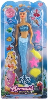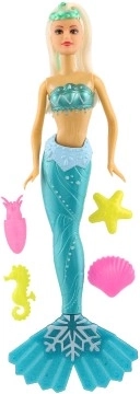 W opakowaniu znajdziesz również tematyczne morskie akcesoria (np. rozgwiazdę, konika morskiego, muszle), które wspierają kreatywność i samodzielną zabawę. Lalka jest dostępna w 3 wersjach kolorystycznych ogona (niebieska, turkusowa, różowa).