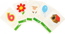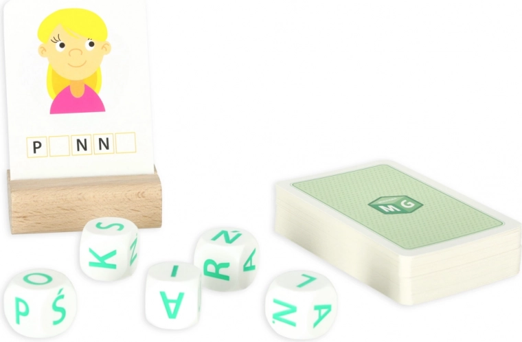 Kostka po kostce - pisanie to prosta gra edukacyjna dla najmłodszych, która wspiera naukę pisania i czytania. Używając czterech kostek, gracze składają trzy- do sześcioliterowe słowa pasujące do obrazków na kartach.