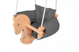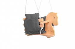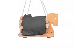 Komfortowa dziecięca huśtawka w designie konika z drewnianą ramą i materiałem tekstylnym, idealna dla wygodnego wypoczynku najmłodszych dzieci.