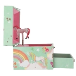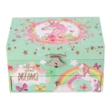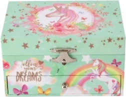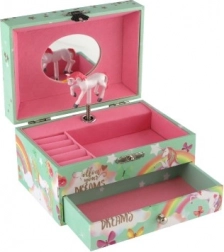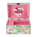 Po nakręceniu kluczyka i otwarciu wieczka figurka jednorożca zaczyna się obracać, a subtelna melodia potęguje magiczny nastrój podczas odkładania biżuterii.