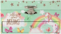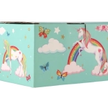 Solidny karton z metalowym zapięciem i zawiasami gwarantuje długą żywotność. Pastelowozielone motywy tęczy, gwiazdek i motyli pięknie ozdobią każdy dziecięcy pokój.