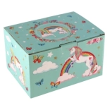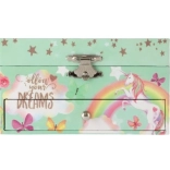 Pastelowozieloną powierzchnię zdobią motywy tęczy, gwiazdek i motyli. Szkatułka wykonana jest z mocnego kartonu, uzupełniona metalowym zapięciem i wytrzymałymi zawiasami dla dłuższej trwałości. Doskonały prezent do dziecięcego pokoju – piękny i jednocześnie praktyczny.