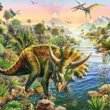 Żywe kolory i szczegółowa ilustracja triceratopsa w świeżej scenerii pobudzają wyobraźnię i koncentrację.