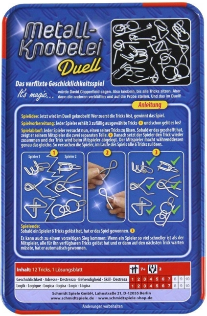 Ten zestaw SCHMIDT Metall-Knobelei Duell oferuje dwanaście sprytnie zaprojektowanych metalowych łamigłówek w poręcznym metalowym pudełku. Każdy element sprawdzi Twoją cierpliwość, logikę i małą motorykę: najpierw rozdziel dwie części bez użycia siły, a następnie przywróć je do pierwotnego kształtu. Dzięki dołączonej ilustrowanej instrukcji możesz w każdej chwili zajrzeć po podpowiedź.