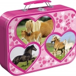 Solidne metalowe opakowanie z motywem koni, idealne do przechowywania i przenoszenia puzzli.